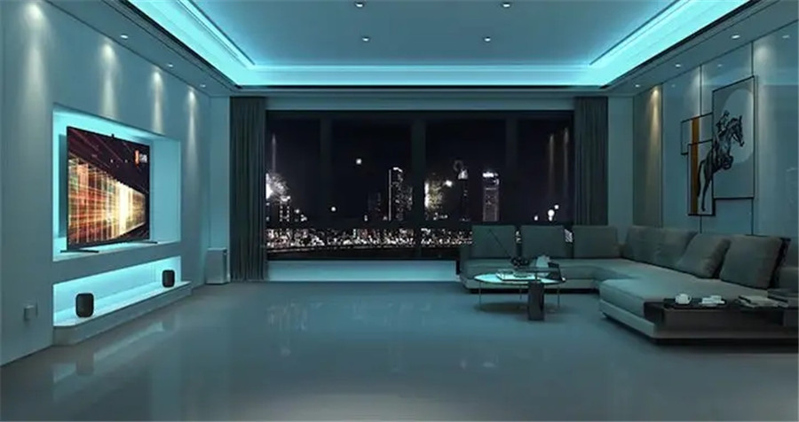 如果想在家欣賞大片的話,則開啟“觀影模式”,那么背景燈自動調(diào)節(jié)到觀影氛圍,客廳其他燈光慢慢暗下來,打造恰到好處的燈光氛圍,身臨其境的觀影體驗,電視自動打開,開始觀看影片。