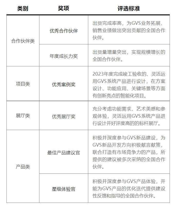 覆蓋面廣。本次評選活動面向GVS全國合作伙伴,包括經(jīng)銷商及項目合作伙伴,涵蓋了企業(yè)、展廳、案例及產(chǎn)品相關類等多個獎項。