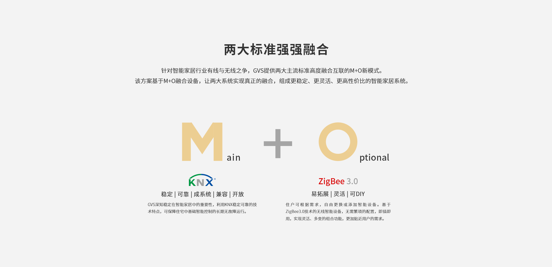針對(duì)智能家居行業(yè)有線與無(wú)線之爭(zhēng),GVS提供兩大主流標(biāo)準(zhǔn)高度融合互聯(lián)的M+O新模式。該方案基于M+O融合設(shè)備,讓兩大系統(tǒng)實(shí)現(xiàn)真正的融合,組成更穩(wěn)定、更靈活、更高性?xún)r(jià)比的智能家居系統(tǒng)。